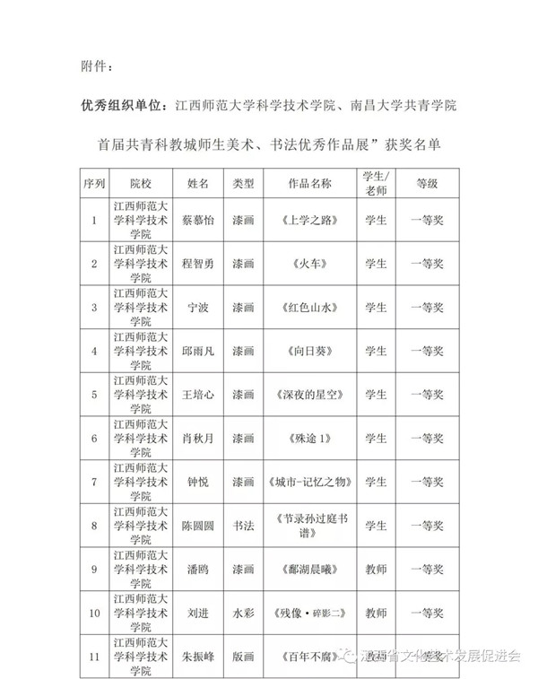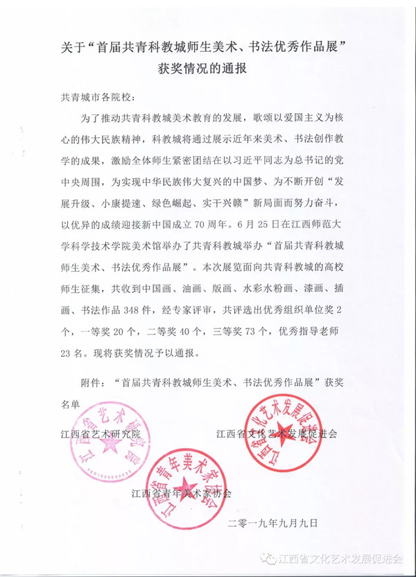 关于“首届共青科教城师生美术、书法优秀作品展”获奖情况的通报 ![]() |