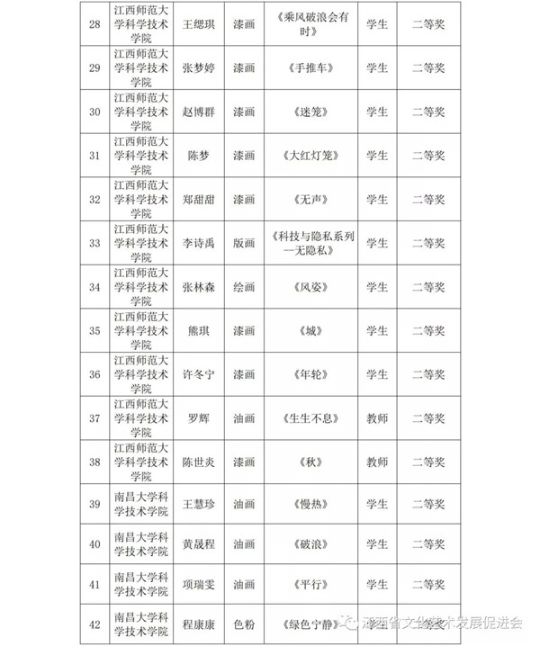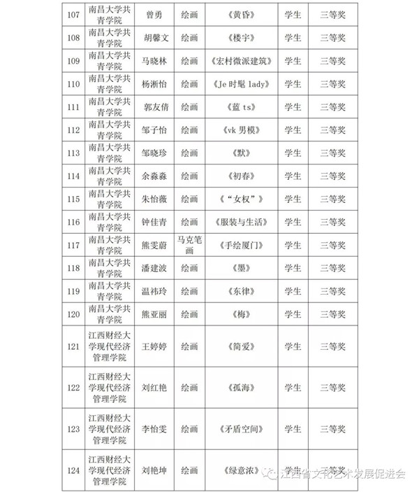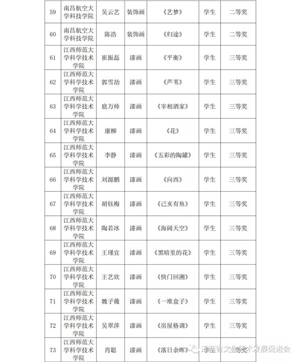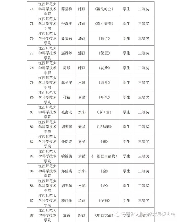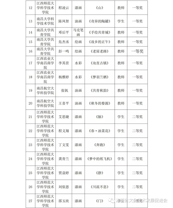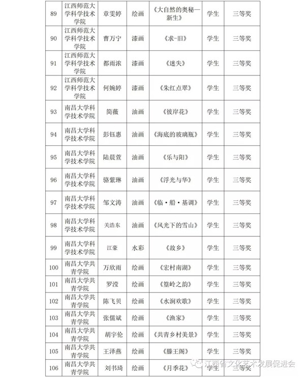 共青城市各院校: 为了推动共青科教城美术教育的发展,歌颂以爱国主义为核心的伟大民族精神,科教城将通过展示近年来美术、书法创作教学的成果,激励全体师生紧密团结在以习近平同志为总书记的党中央周围,为实现中华民族伟大复兴的中国梦、为不断开创“发展升级、小康提速、绿色崛起、实干兴赣”新局面而努力奋斗,以优异的成绩迎接新中国成立70周年。6月25日在江西师范大学科学技术学院美术馆举办了共青科教城举办“首届共青科教城师生美术、书法优秀作品展”。本次展览面向共青科教城的高校师生征集,共收到中国画、油画、版画、水彩水粉画、漆画、插画、书法作品348件,经专家评审,共评选出优秀组织单位奖2个,一等奖20个,二等奖40个,三等奖73个,优秀指导老师23名。现将获奖情况予以通报。 |